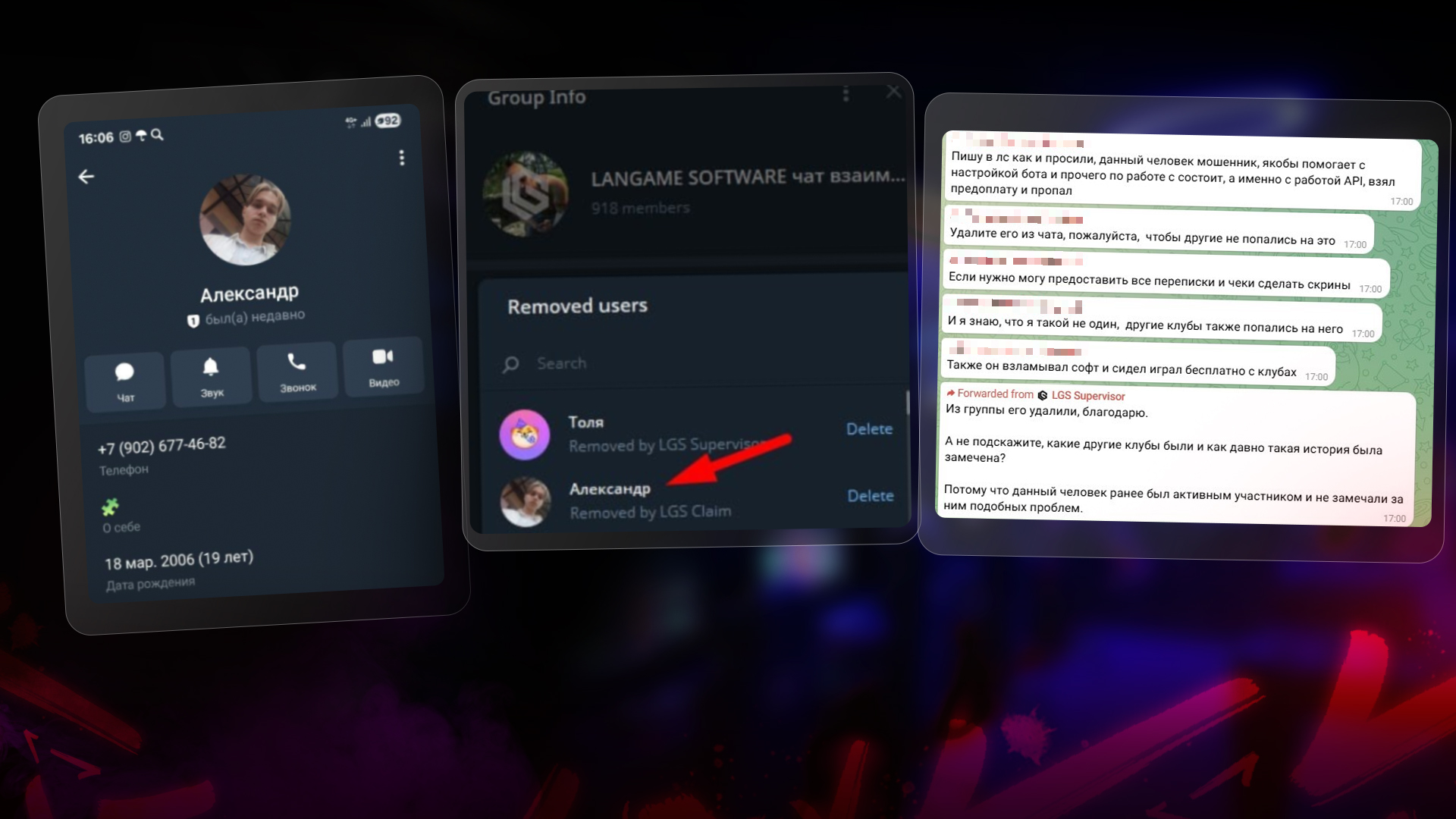 На днях коллеги из техподдержки принесли нам забаненный аккаунт некоего Александра Дружинина. К ним обратился один из владельцев клубов, который этому Александру перевел деньги за помощь с работой по API, настройкой бота и прочими техническими вопросами. Первый заказ Александр выполнил честно, но потом, как и положено героям подобной рубрики, взял деньги и пропал, только его и видели. Обеспокоенный владелец клуба отправился изучать вопрос, пообщался с представителями других клубов и выяснил, что этот Александр подобные финансовые маневры проворачивает не в первый раз. Собрав чеки, скрины переписок и прочую базу, коллега написал нашей техподдержке.