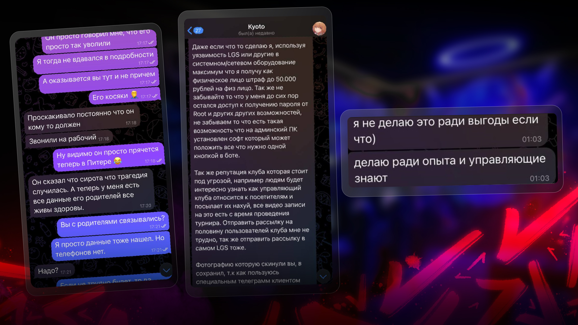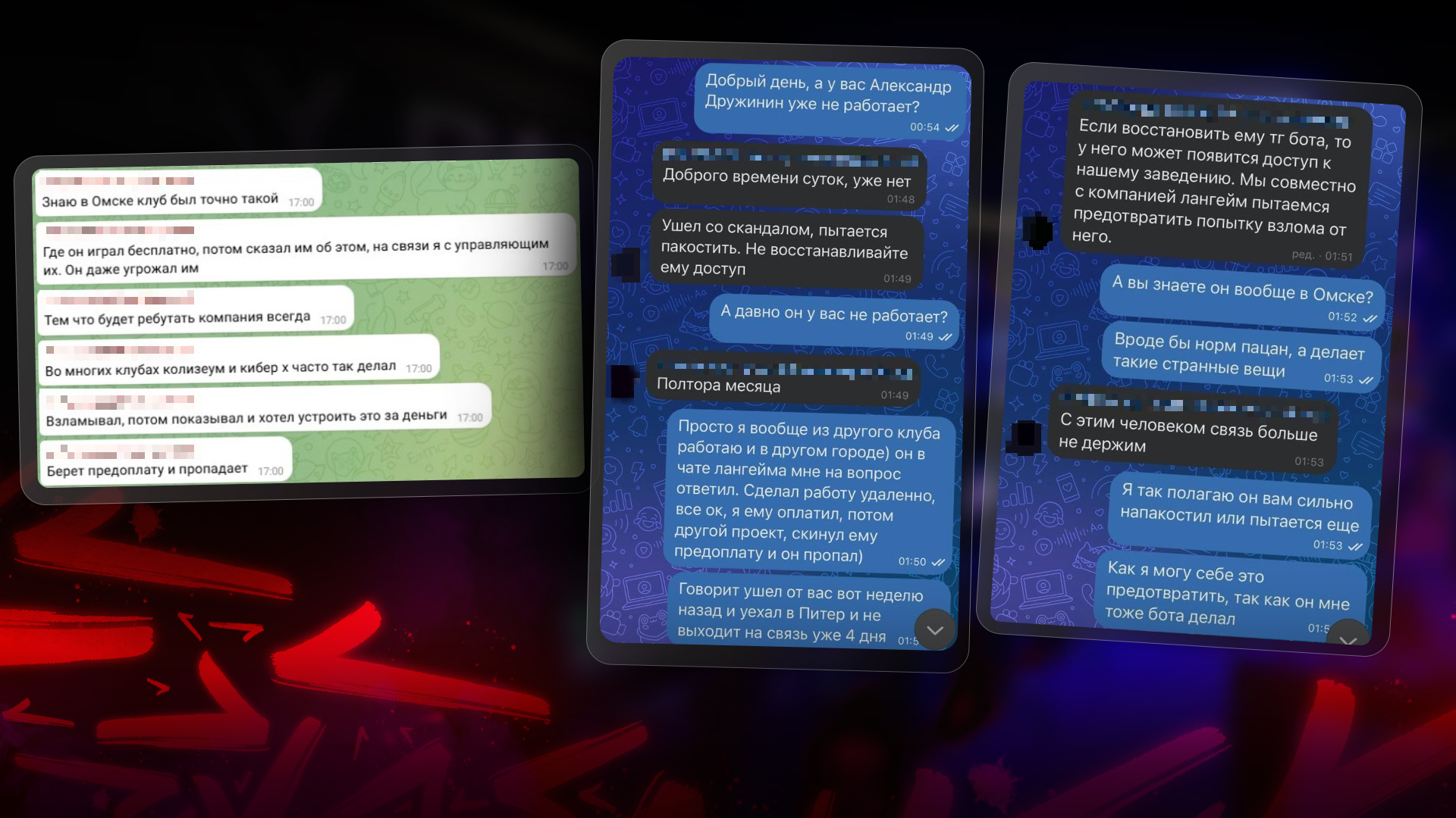 Помимо всяких технических настроек, за которые он взял деньги и исчез, Александр занимался шантажом, взломом и тому подобным вредительством. Управляющий одного компьютерного клуба в Омске рассказал, что данный персонаж ушел от них со скандалом, а после пытался пакостить, используя Telegram-бота. Так, Александр угрожал представителям клуба вредительскими рассылками гостям в Telegram.